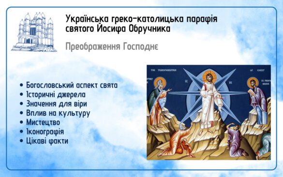 Преображення Ісуса Христа на горі Тавор – це одне з великих християнських свят. Згідно з Євангелієм, під час цієї події Христос змінює свій вигляд перед трьома апостолами – Петром, Яковом і Іваном, і Його обличчя та одяг засяяли яскравим світлом. Також з’являються пророки Мойсей і Ілля, які розмовляють з Ним. Свято символізує божественну природу Христа.
