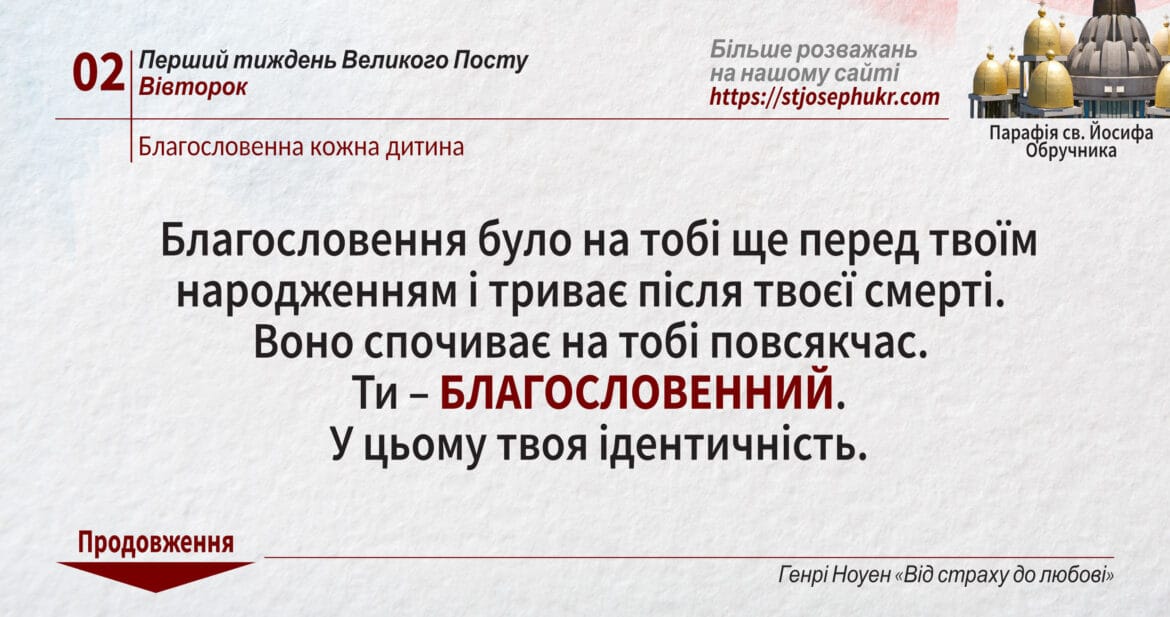Ти – особа, саме сотворення якої є благословенне, і це благословення ніколи не залишає тебе. Твоїм завданням є прийняти, засвоїти це «первородне» благословення дитини Того, Хто його тобі уділив. Хоч ти уражений первородним гріхом, однак був зцілений «первородним» благословенням. Цим «первородним», первісним благословенням є безумовна любов Бога, вона була в Його розумі та серці ще до твого зачаття. Благословення було на тобі ще перед твоїм народженням і триває після твоєї смерті. Воно спочиває на тобі повсякчас. Ти – благословенний. У цьому твоя ідентичність.