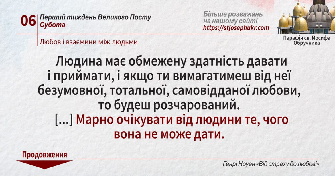 Милостивий Боже, дай мені пам’ятати, що досконала любов приходить тільки від Тебе. Дай мені смиренно дарувати мою власну обмежену любов людям поруч мене.