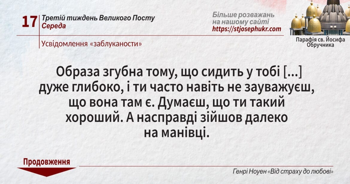 Проблема образи полягає в тому, що вона не є така чітка, — вона не ефектна, не явна і може ховатися за видимістю святого життя. Образа згубна тому, що сидить у тобі, в твоєму серці, в твоїх костях і в твоєму тілі дуже глибоко, і ти часто навіть не зауважуєш, що вона там є. Думаєш, що ти такий хороший. А насправді зійшов далеко на манівці.