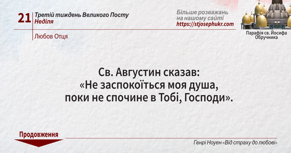Первородний гріх, той внутрішній біль і внутрішня розбитість, що не залежать навіть від наших власних вчинків, може стати місцем, де ми діткнемось і нашого «первородного», первісного, благословення. Так виходить, що наш зламаний батько, обмежена мати, нервовий брат, сестра, яка заплуталася в собі, або власна внутрішня боротьба штовхають нас до того, щоб ми вийшли поза свій біль. Це стає нашою потребою. Св. Августин сказав: «Не заспокоїться моя душа, поки не спочине в Тобі, Господи».