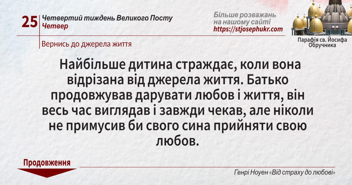 Бог ніколи, повторюю, ніколи, не вводить людину в страждання. Ніколи. Боже серце не здатне на це. Але Бог говорить нам: «Якщо ви пориваєте зі своїм справжнім єством, якщо залишаєте свій правдивий дім, то будете глибоко страждати, тому що поза моєю любов’ю ви не можете жити. Тому я хочу, щоб ви завжди верталися до мене». Ось чому повернення сина робить батька таким щасливим. Найбільше дитина страждає, коли вона відрізана від джерела життя. Батько продовжував дарувати любов і життя, він весь час виглядав і завжди чекав, але ніколи не примусив би свого сина прийняти свою любов.