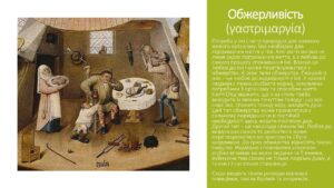 Першою пристрастю є обжерливість — надмірна прив’язаність до їжі і тілесних задоволень. Їжа сама по собі не є гріхом, але коли людина починає шукати лише насолоди, вона поступово втрачає духовну свободу.