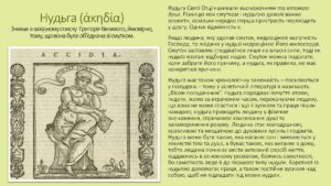 Шоста пристрасть — нудьга, або акедія. Це особливий стан духовної втоми, коли людині стає важко молитися, працювати над собою і вона втрачає духовну ревність.