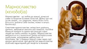 Сьомою пристрастю є марнославство — прагнення людської похвали, бажання виглядати добрим в очах інших.