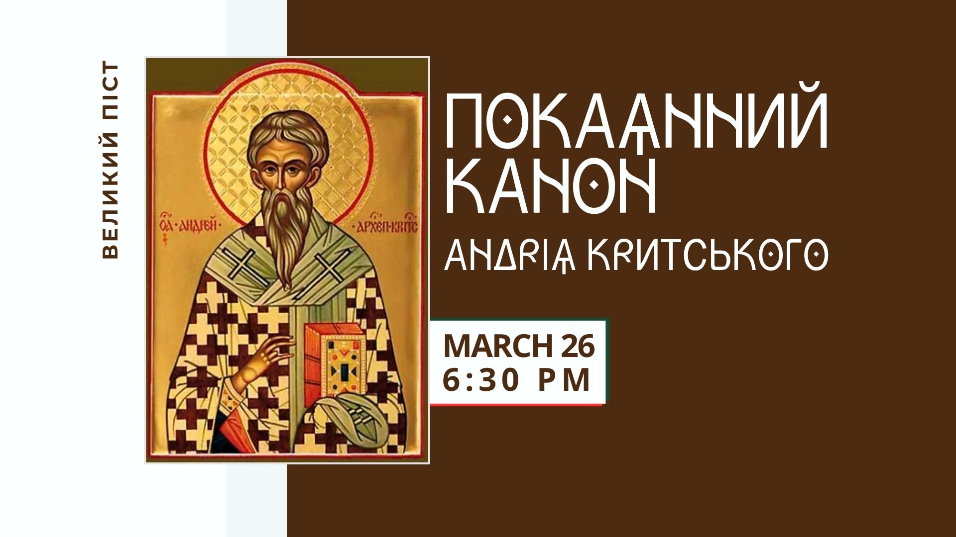 26 березня, о 6:30 PM, запрошуємо вас на особливу великопісну молитву – Утреню з каноном святого Андрея Критського. Ця служба, яку Церква звершує наприкінці Великого посту, знову будить серце до покаяння, витривалості й надії, а приклад святої Марії Єгипетської нагадує: ніколи не є запізно повернутися до Бога.